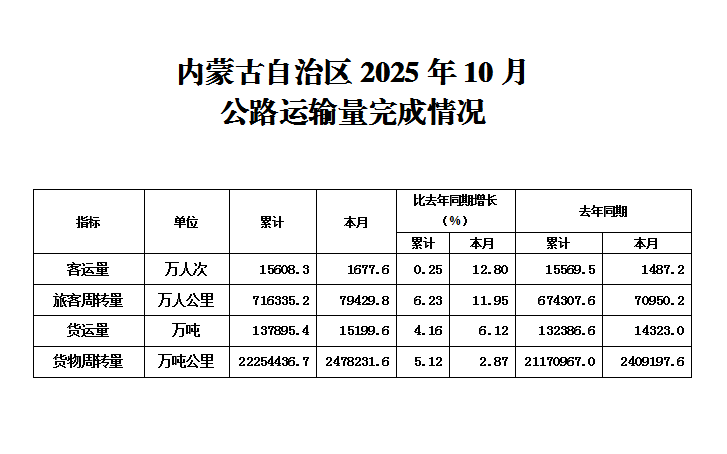 内蒙古自治区2025年1-10月公路运输量完成情况