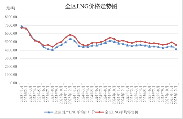 2025年12月,全区国产LNG(液化天然气,下同)平均出厂价格、LNG平均零售价格分别为每吨4166.00元、4625.23元,环比分别下降6.64%、6.09%,同比分别下降12.27%、10.21%。