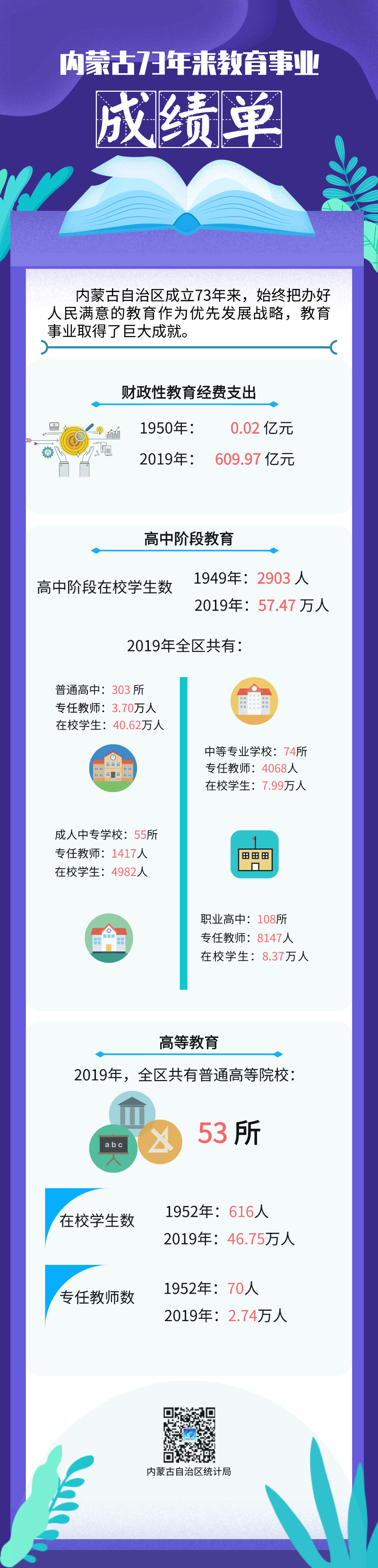 趁着高考“余温”,小编用统计数据带领大家看看内蒙古自治区成立73年来在教育方面取得的成绩,领略下内蒙古教育这张“成绩单”!