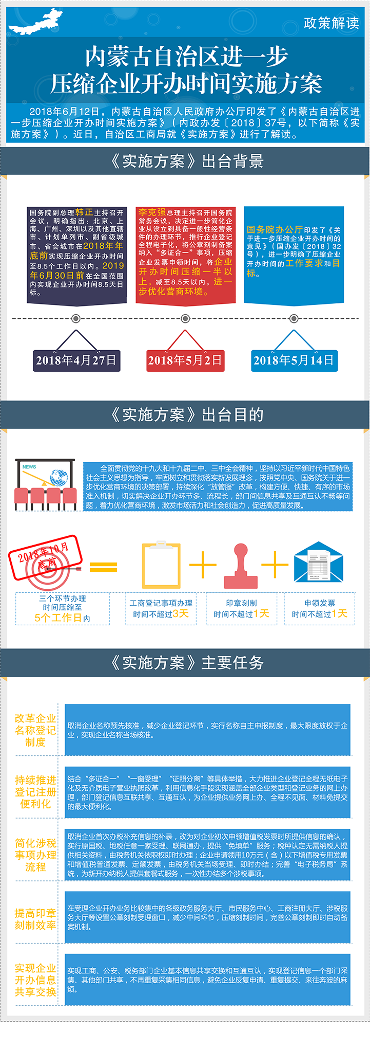 2018年6月12日,ld体育中国官方网站办公厅印发了《内蒙古自治区进一步压缩企业开办时间实施方案》(内政办发〔2018〕37号,以下简称《实施方案》)。近日,自治区工商局就《实施方案》进行了解读。