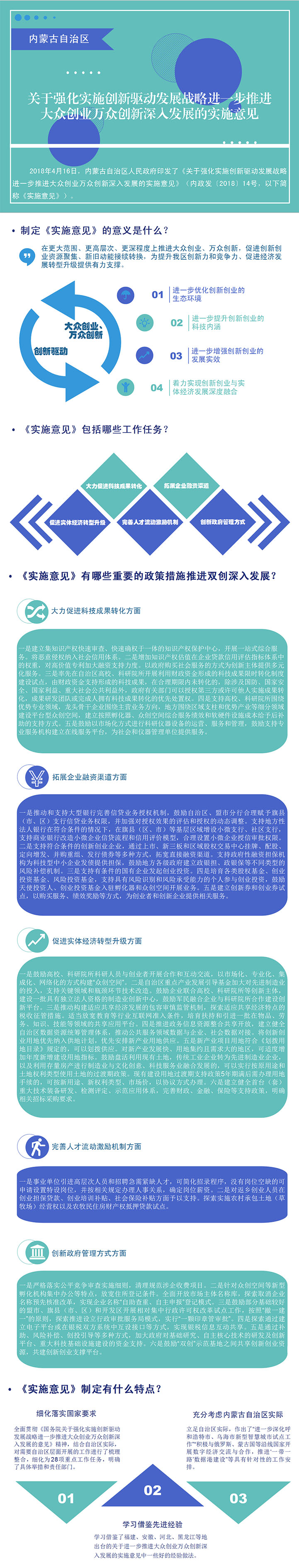 一是细化落实国家要求。全面贯彻《国务院关于强化实施创新驱动发展战略进一步推进大众创业万众创新深入发展的意见》精神,结合自治区实际,对需要自治区层面开展的工作进行了梳理整合,细化为28项重点工作任务,明确了具体举措和责任部门。