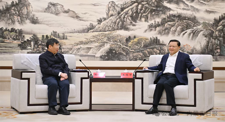 王伟中代表自治区党委和政府对刘伟平一行表示欢迎,对三峡集团长期以来给予内蒙古的支持表示感谢,并介绍了全区经济社会发展特别是新能源发展情况。他说,当前我们正在深入学习宣传贯彻党的二十届四中全会精神,全面贯彻落实习近平总书记对内蒙古系列重要讲话重要指示精神,按照习近平总书记、党中央对内蒙古的战略定位,科学谋划“十五五”时期全区经济社会发展。“十五五”期间,内蒙古将坚持风光水核等多能并举,着力提高新能源开发利用水平,与三峡集团的合作拥有巨大空间。希望三峡集团充分发挥自身优势,在加快推进“沙戈荒”基地等项目建设的同时,加大储能、氢能等领域的资金投入和科技创新力度,在内蒙古建成一批绿电就地消纳示范项目。我们将全力打造市场化、法治化、国际化一流营商环境,为包括三峡集团在内的各类企业来内蒙古发展提供优质高效服务。