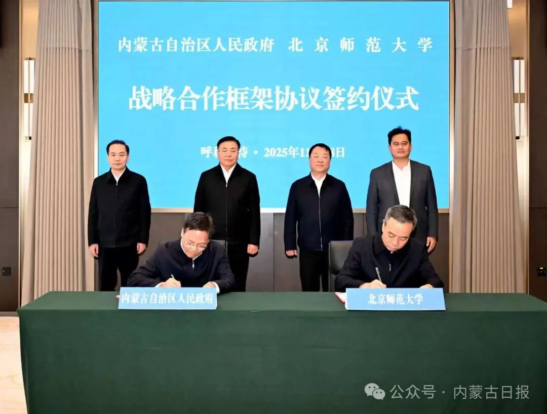 11月18日,自治区党委副书记、自治区人民政府主席包钢与北京师范大学党委书记程建平共同见证自治区人民政府与北京师范大学签署战略合作框架协议。草原云·内蒙古新闻网记者 韩卿立 摄